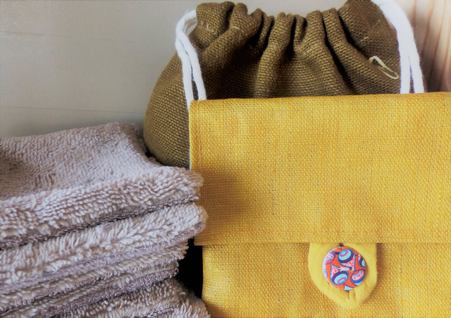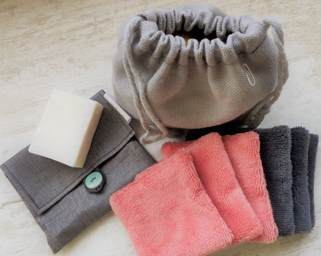 Coffret zéro déchet pour la beauté. Coffret comprenant : 4 lingettes, 1 pochon de rangement en lin recyclé, 1 pochette à savon en lin enduit