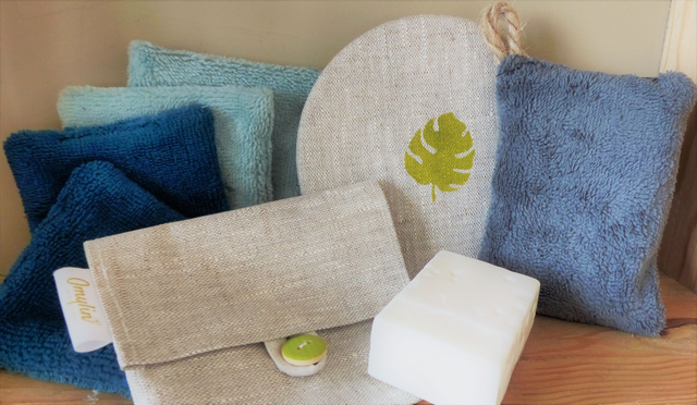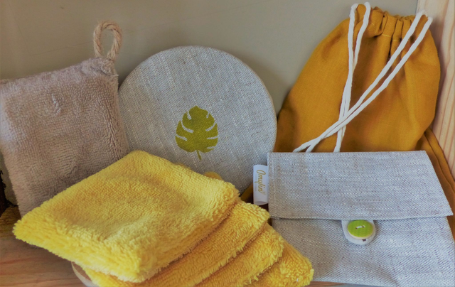 Coffret Zéro Déchet comprenant : 4 lingettes, 1 pochette à savon, 1 couvre bol, 1 éponge, emballé dans 1 pochon cadeau en tissu.