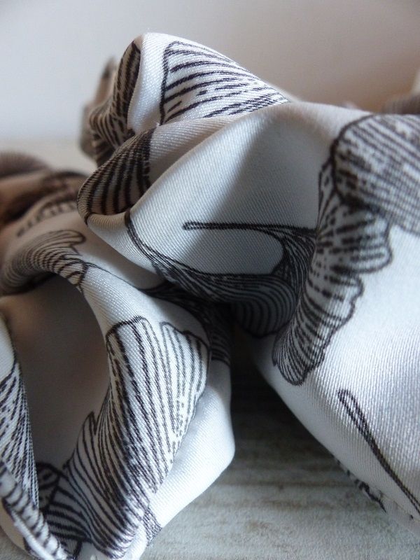 Chouchou réalisé avec des restes de satin de soie. Adapté à vos cheveux il adopte un look douceur à votre coiffure. Le motif est une feuille de ginko gris sur fond blanc.