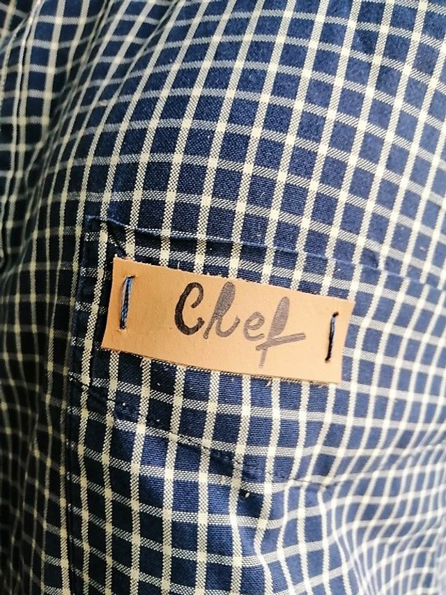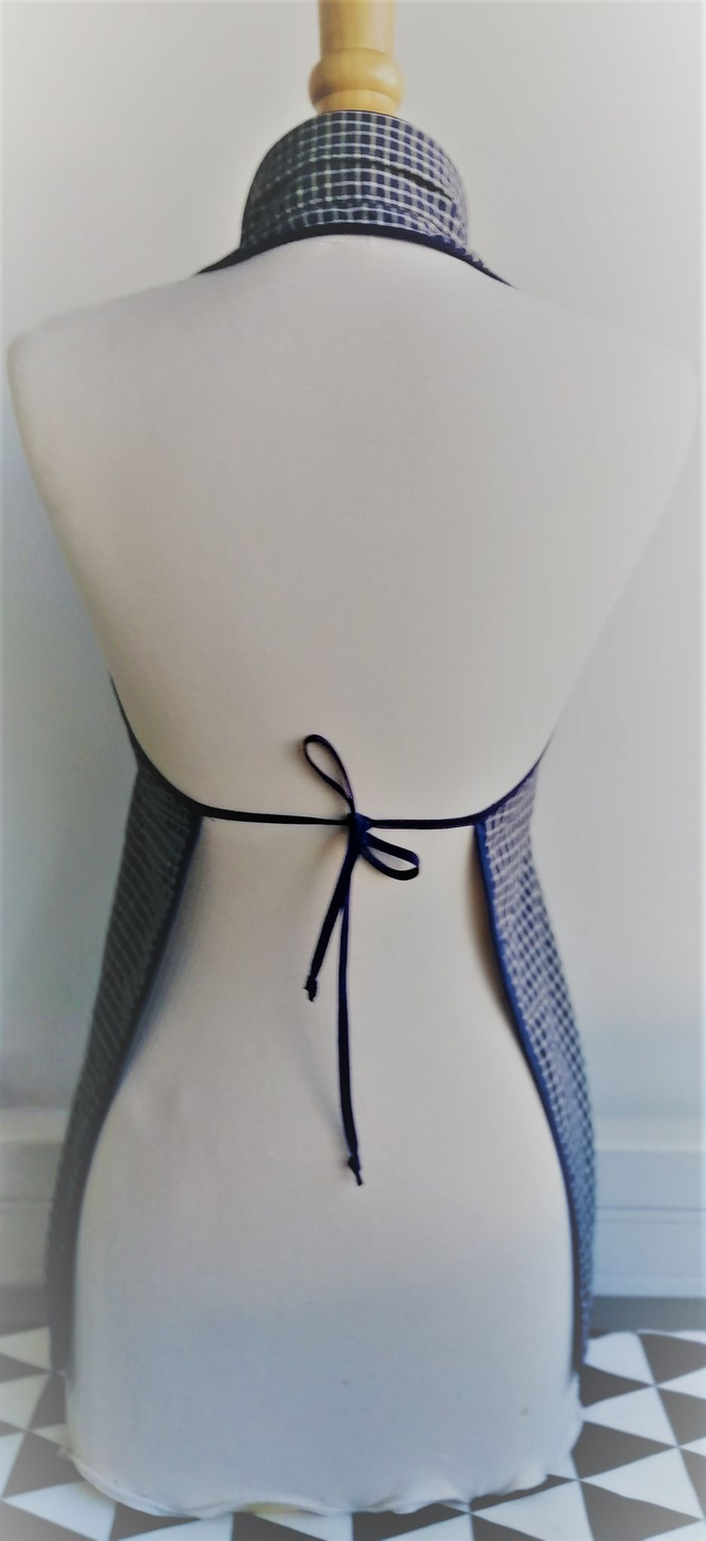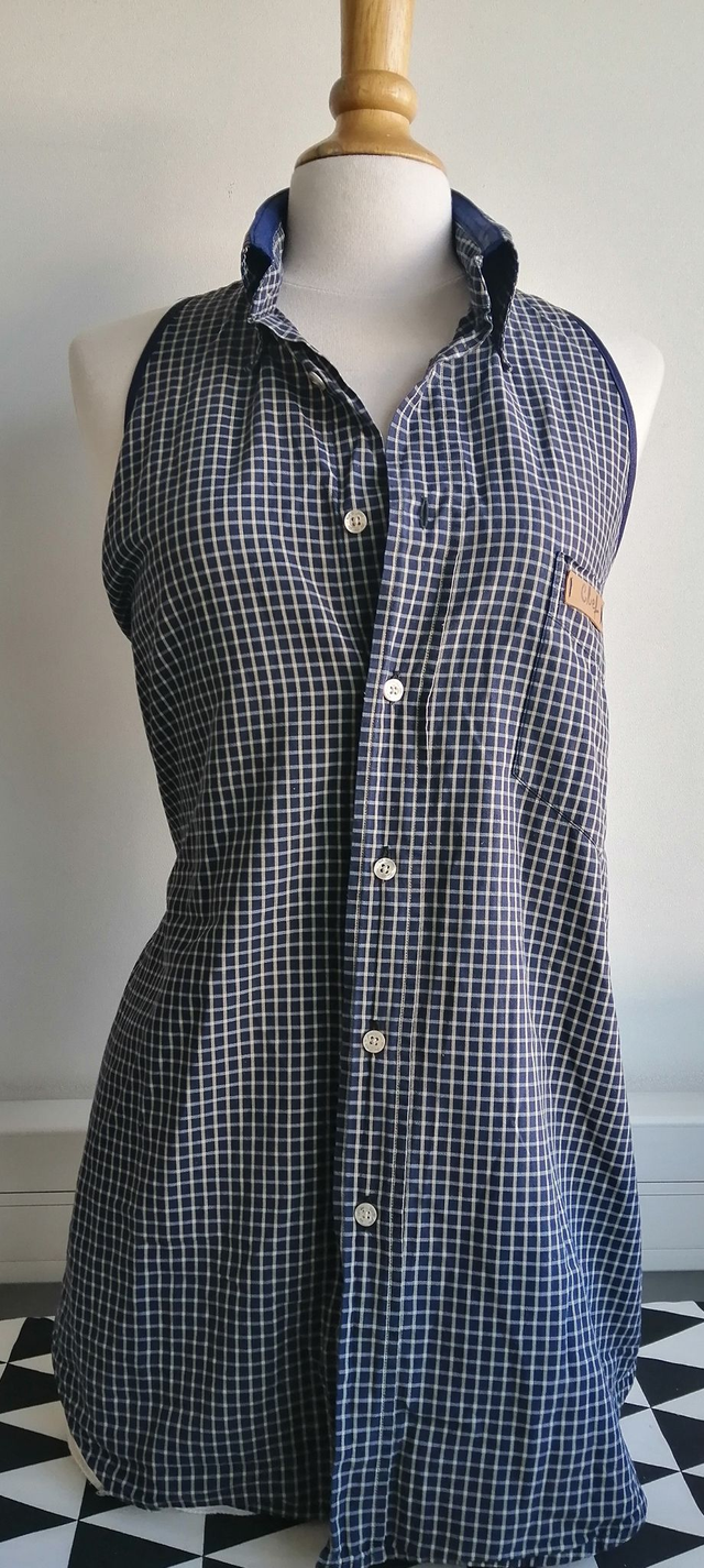 Tablier réalisé à partir d'une chemise homme en coton. Les manches et le dos on été enlevé et de nouvelles finitions avec biais bleu marine on fait leur apparition. Sur la photo de détail, il y avait un motif brodé, j'ai rajouté une pièce de cuir et apposé la marque chef avec mes petites mains.